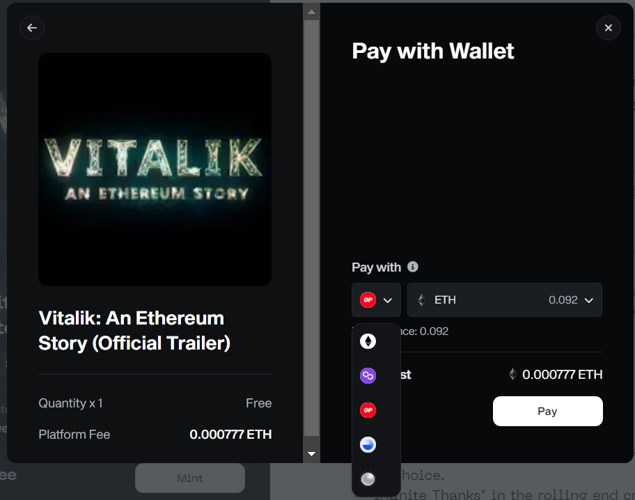 每鑄造一個的費用是 0.000777 ETH(大約 2.7 美元),選擇你想要的錢包網路(ETH、OP、MATIC…)並確認有足夠手續費之後,點擊 Pay 即可成功鑄造。