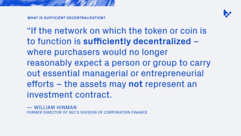 基於這個邏輯,Hinman 認為以太坊不屬於證券銷售,因為當前的以太坊網路足夠去中心化。