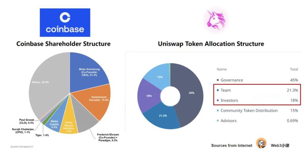 如上圖 Coinbase IPO 時的股權架構,創始團隊和投資人佔了至少 70% 的股份,股票的漲跌與整天使用 Coinbase 交易的使用者沒有任何關係。更實在點的話是,你整天用 Coinbase 交易,為 Coinbase 貢獻業績,Coinbase 又給到了你什麼利益?