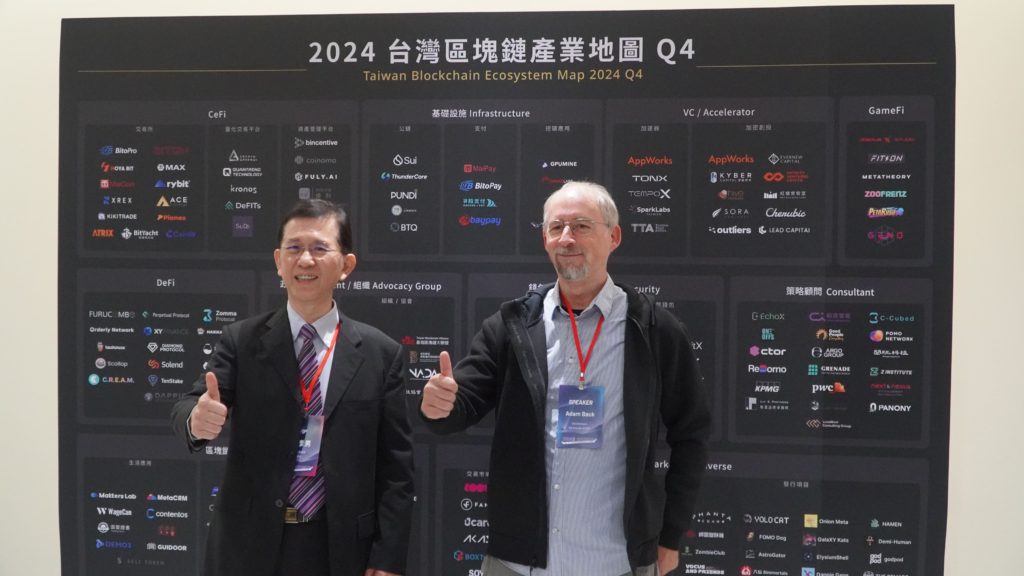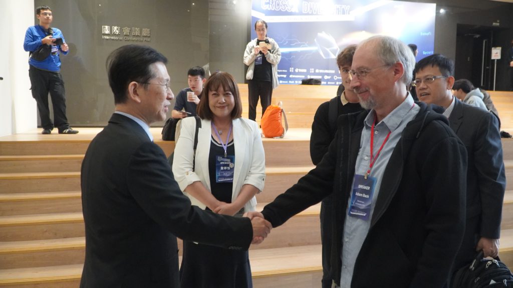 曾被投票最像中本聰的候選人「Adam Back」,在 11/18於台灣政大公企中心現身,與數位發展部部長黃彥男、國發會副主委詹方冠等台灣官員交流,並向眾人演講並推廣比特幣的普世價值。
