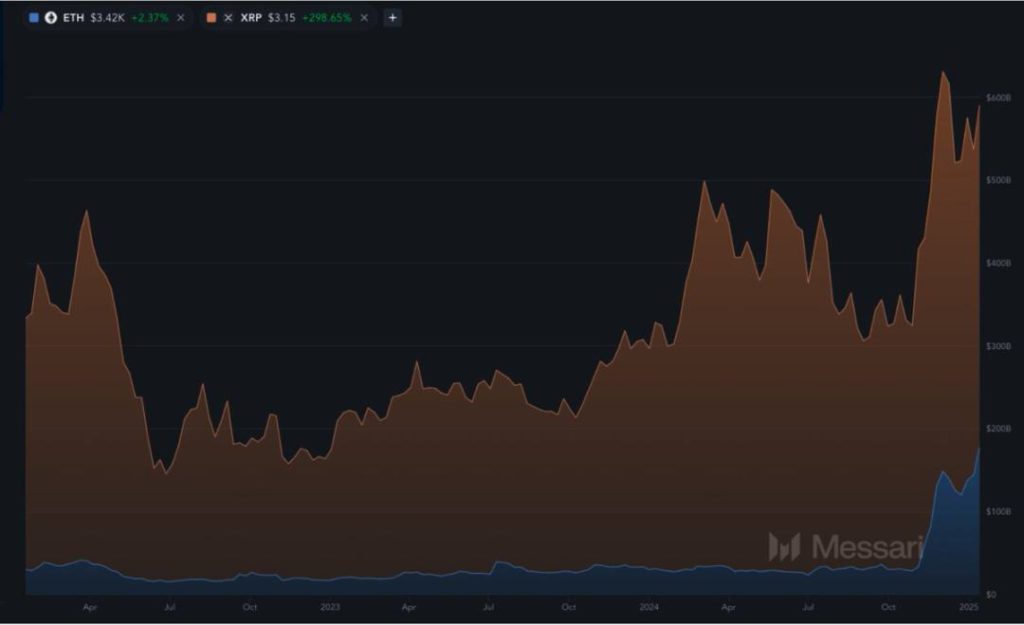 在美國大選之後的幾個月裡,XRP 經歷了明顯上漲。自那時起,XRP 價格漲幅超過 460%,市值已經超過 BNB、USDT 和 SOL。按完全稀釋估值(FDV)計算,XRP 的估值是 Solana 的兩倍,約為以太坊的三分之二。