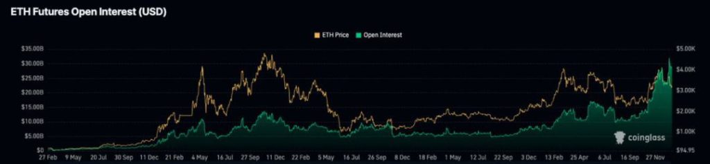 從各項指標來看,以太坊似乎估值過高。未平倉合約量處於歷史高位,而 ETH 價格仍較 4800 美元的歷史高點下跌了 30%。